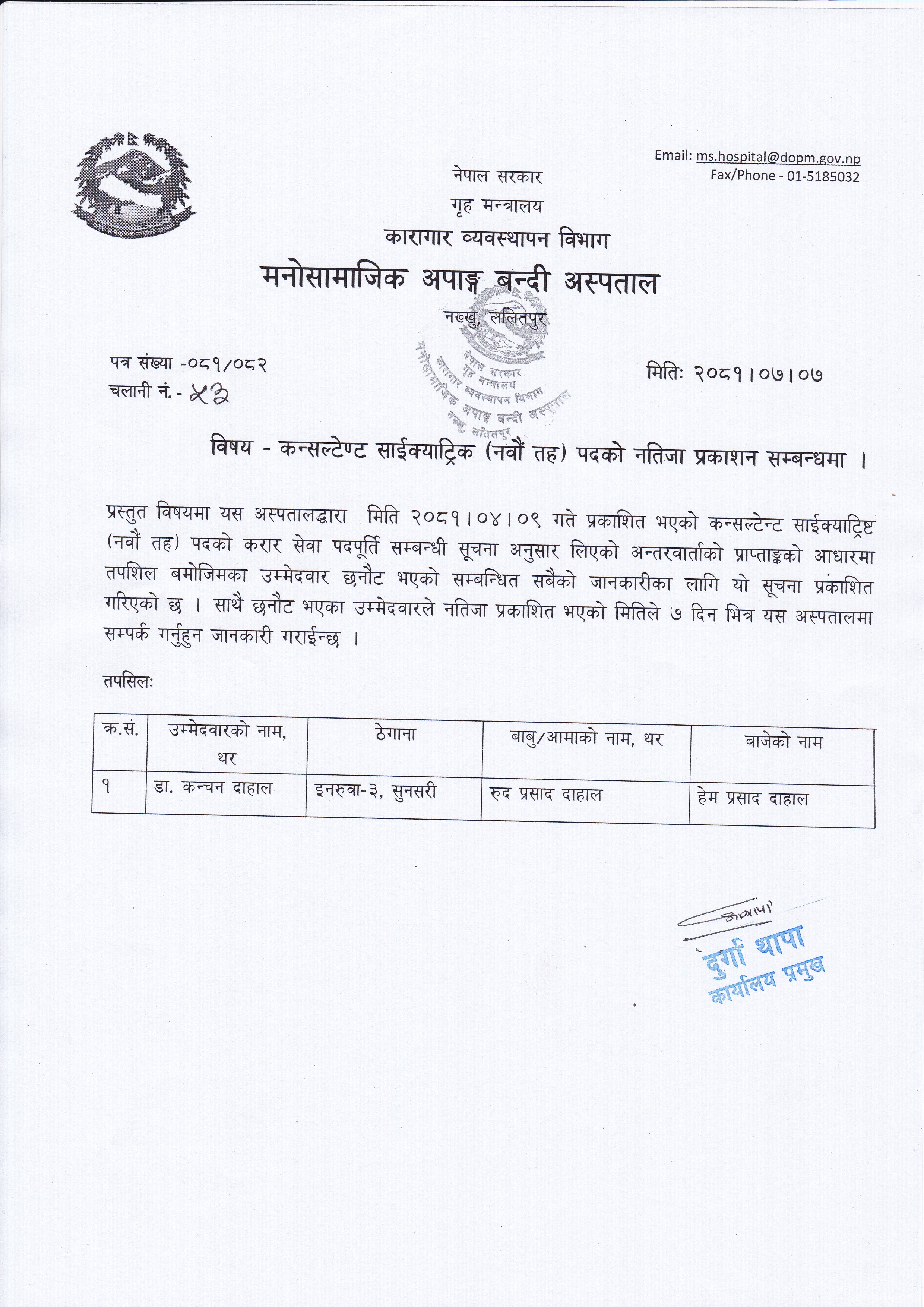 कन्सल्टेन्ट साइक्याट्रिष्ट (नवौं तह)पदको नतिजा प्रकाशन ।
